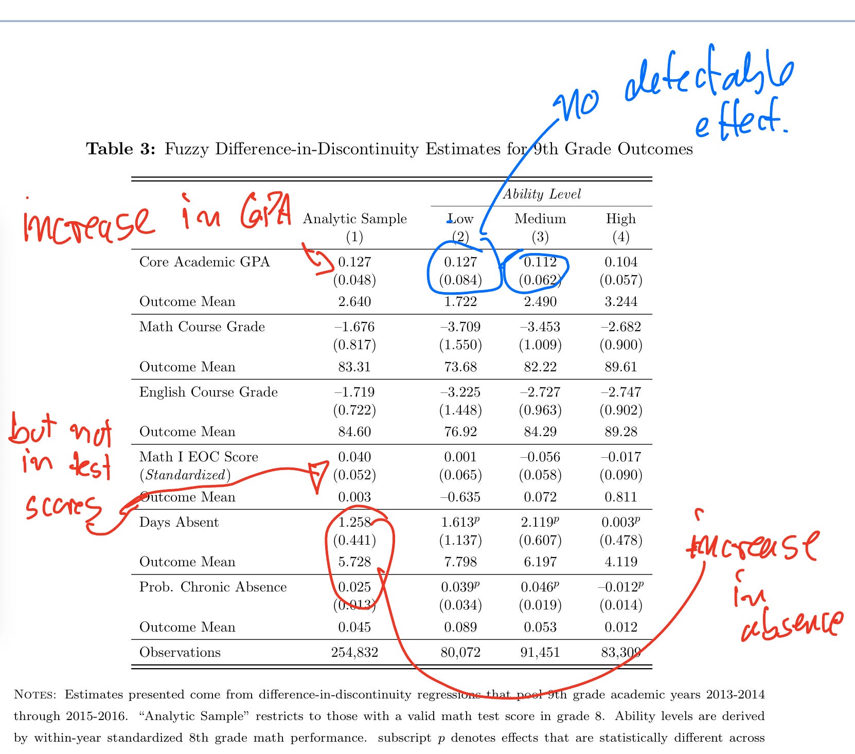 Increase in overall GPA. That is what we would expect mechanically. BUT the effect is not significant for the low ability (based on prior attainment) group. That is puzzling, because remember, they experienced the largest differences.