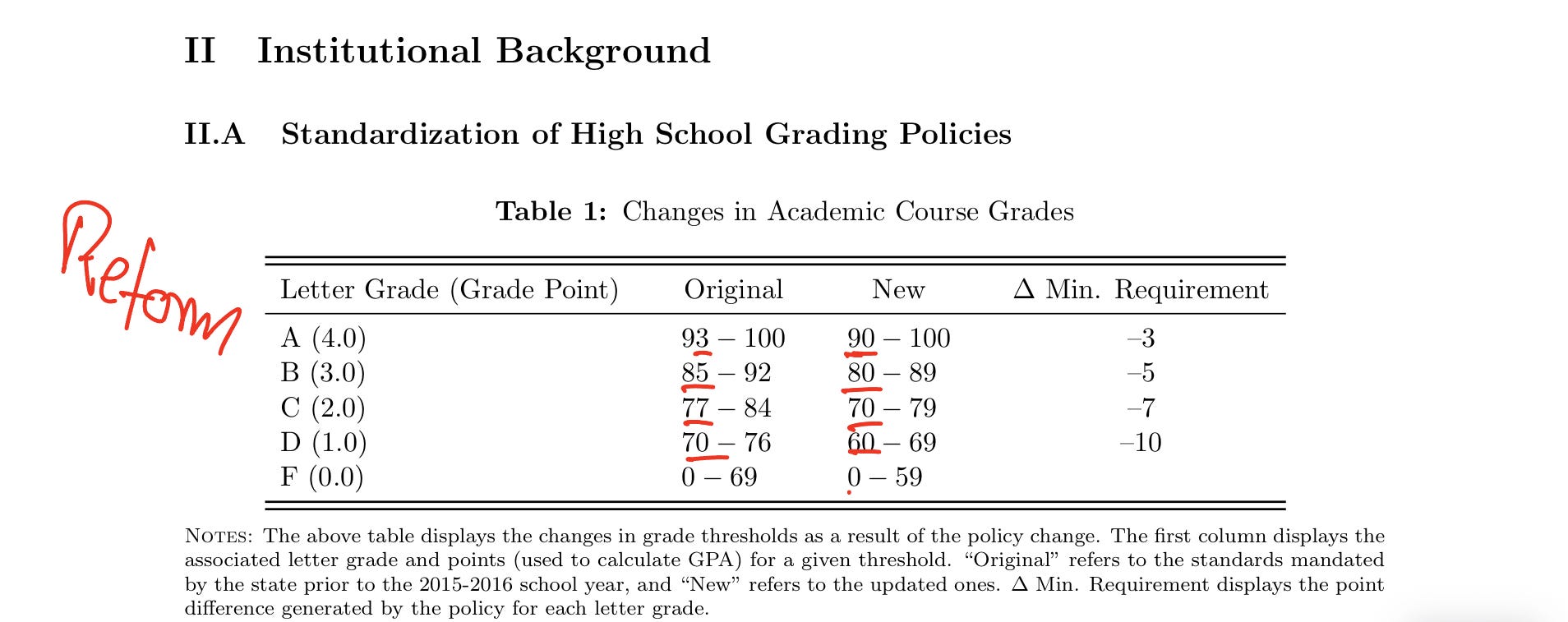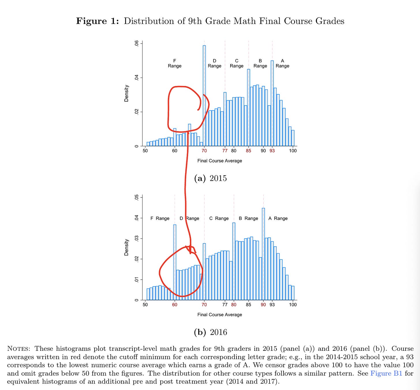 Someday I will find a way to test my hypothesis above. While waiting, I read a new paper by A. Brooks Bowden, Viviana Rodriguez and Zach Weingarten that does something related. The paper is accepted for publication in AEJ:EP. They study a reform where they adjusted grading standards in schools in North Carolina.