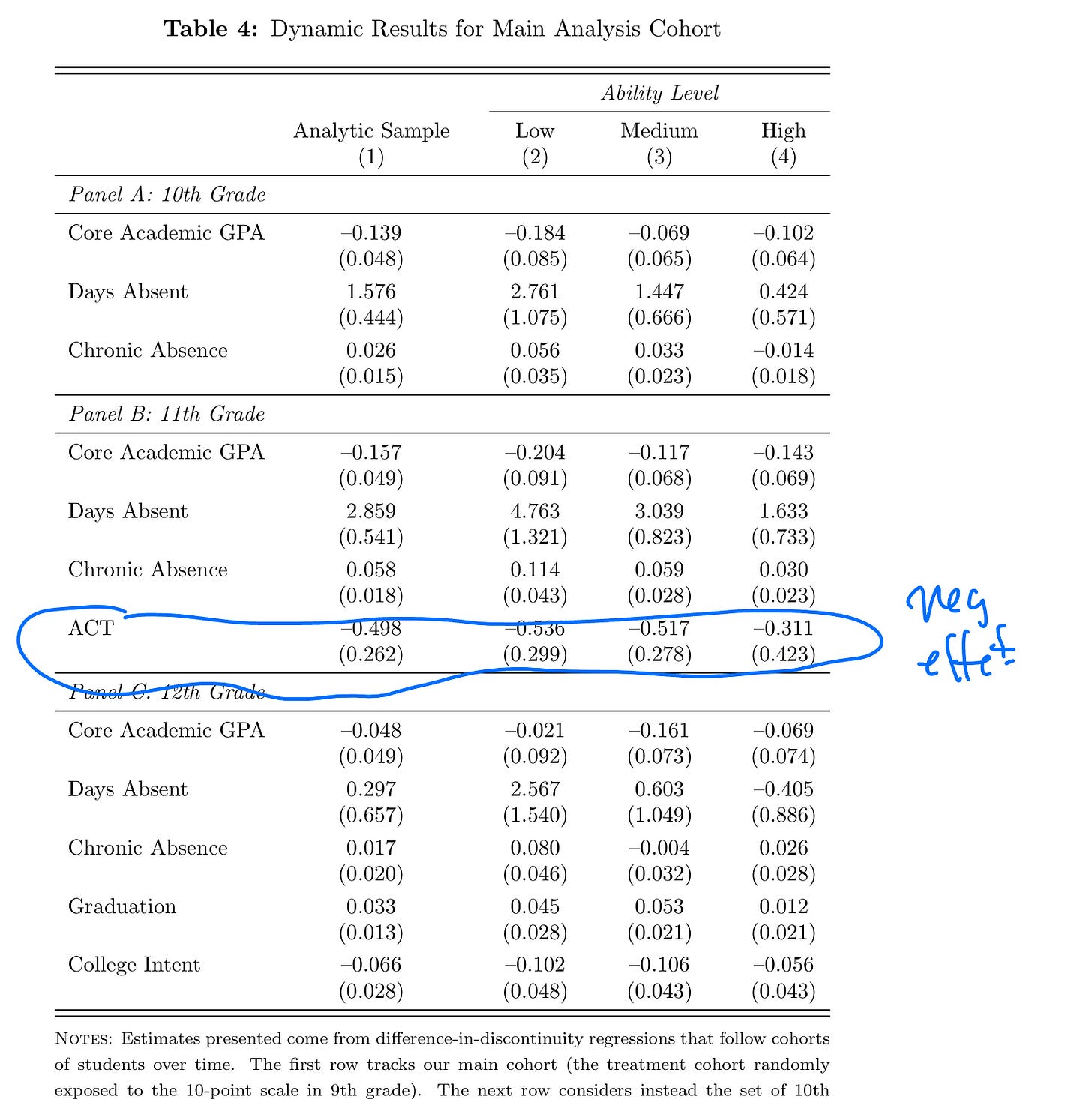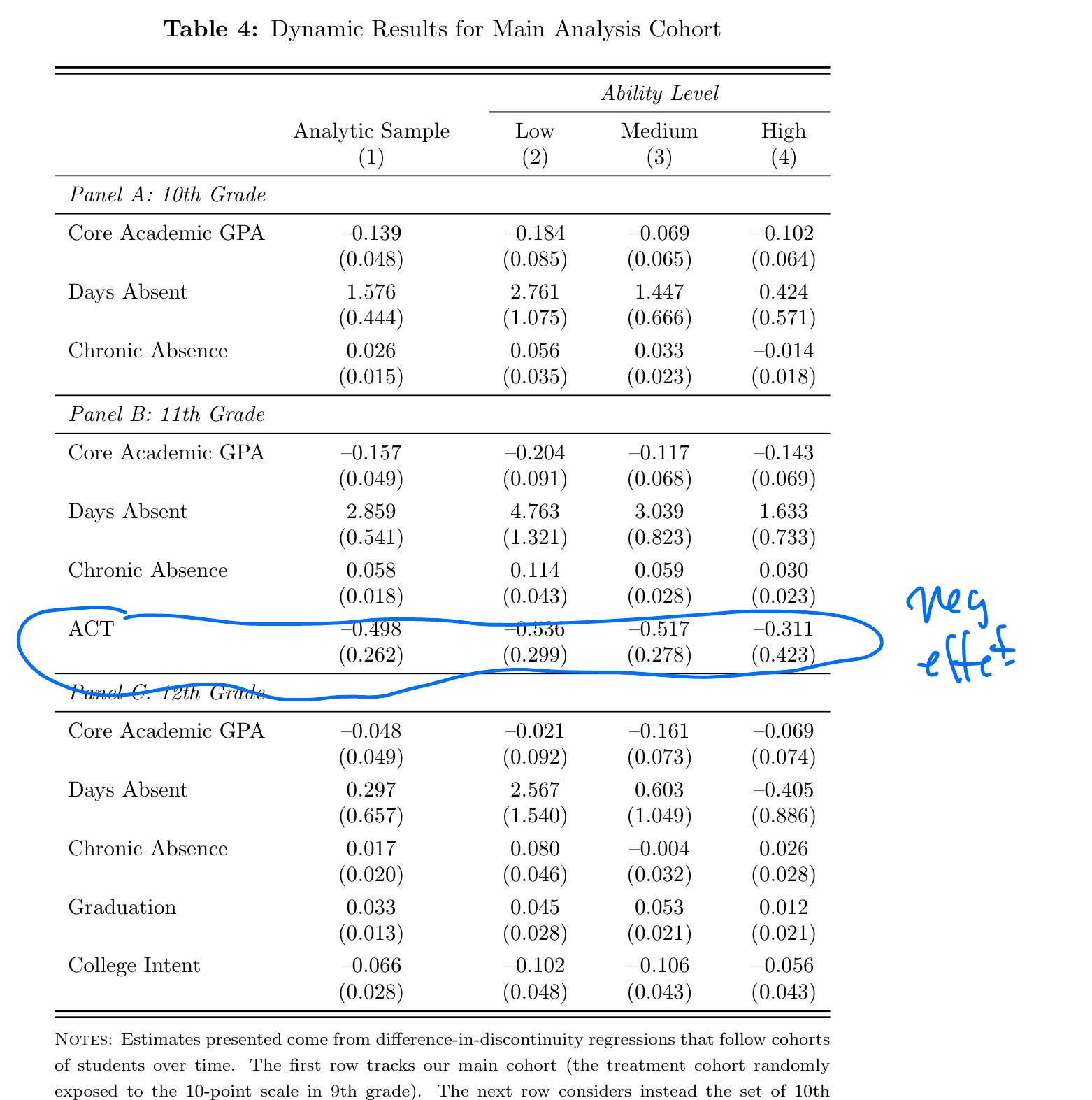 To get a sense of actual learning effects, they look at later ACT scores. Unlike the GPA results, they are not contaminated by the direct effect of the reform. And indeed, they find signs of worse ACT scores later on. Especially for the low and medium ability groups.